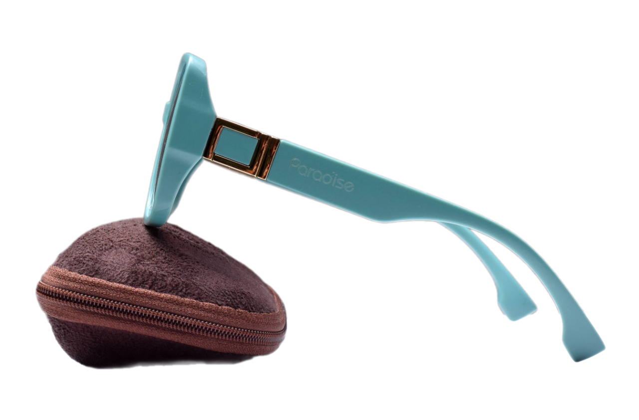 Aro em TR-90 na cor verde água fosco. Hastes com detalhe em dourado. Lentes polarizadas azul degradê.